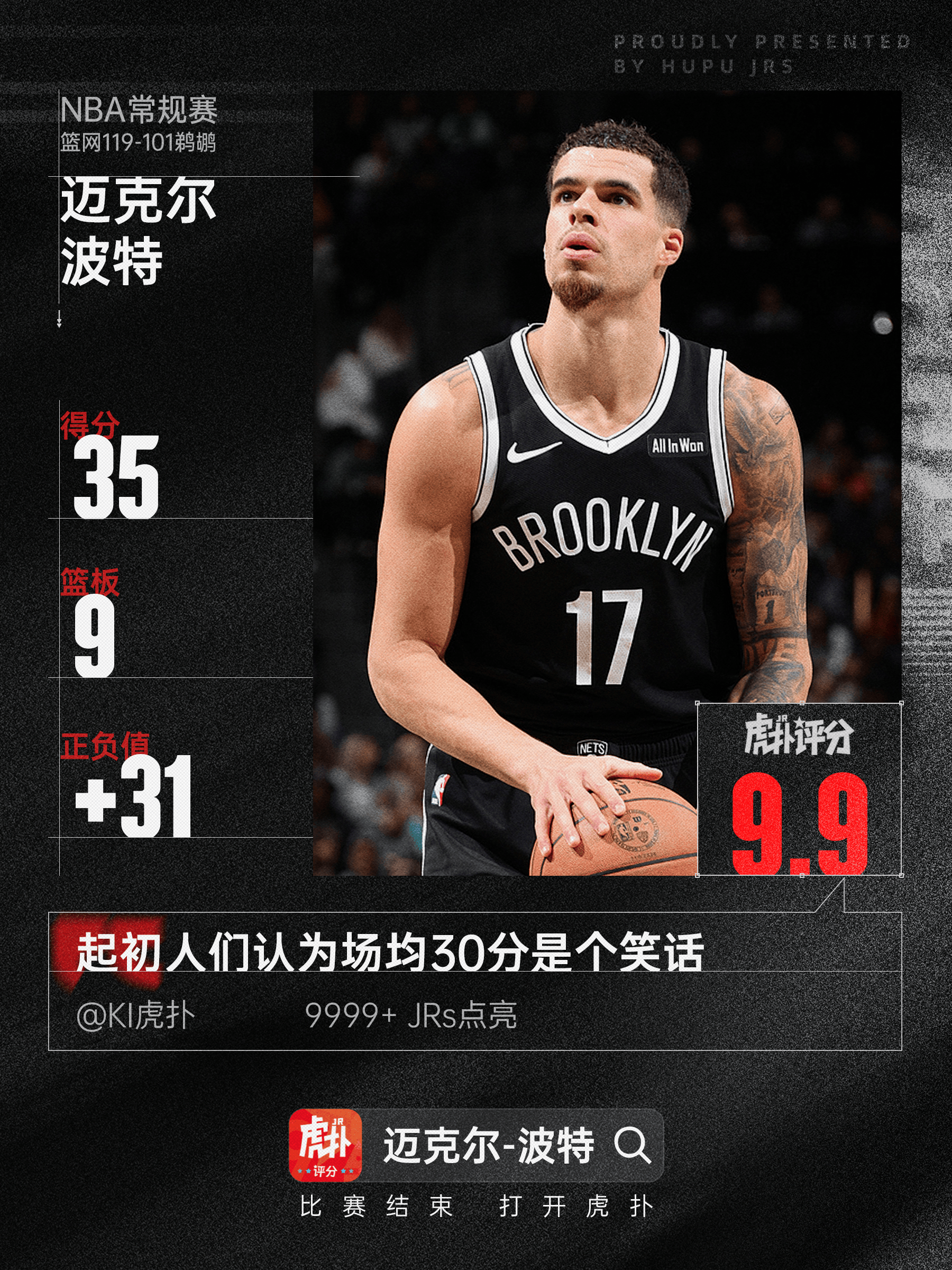 本場(chǎng)比賽,籃網(wǎng)球員邁克爾-波特出戰(zhàn)33分鐘,23投14中,其中三分球10投5中,罰球2投2中,得到35分9籃板3助攻2搶斷1封蓋。